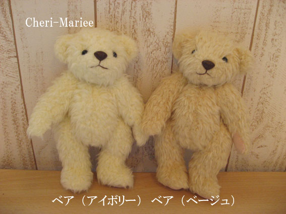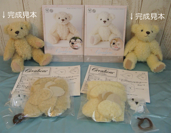 ベアキットはすでにカットされています。 くまさえ作れば、衣装は完成品を選んで着せるだけという、 簡単手作りキットです。 身長は約22cmです。 キットには、綿は含まれておりません。 アイボリー色のベア作品見本です。 (手作りキットでお届けします)