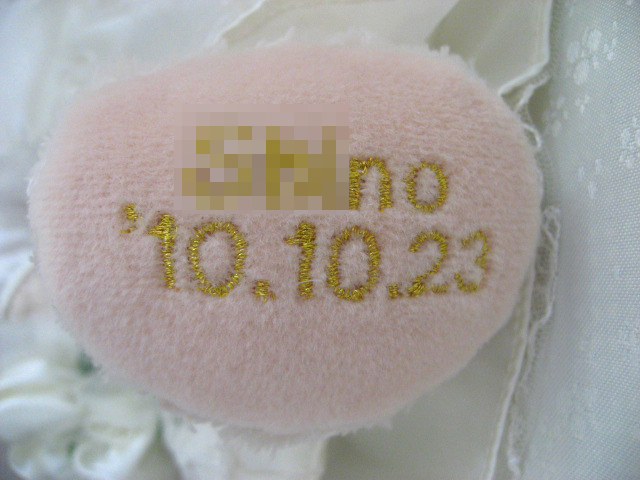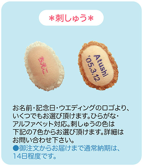 片足にはお名前、もう片足には「wedding」の文字と記念日という刺繍も可能です。