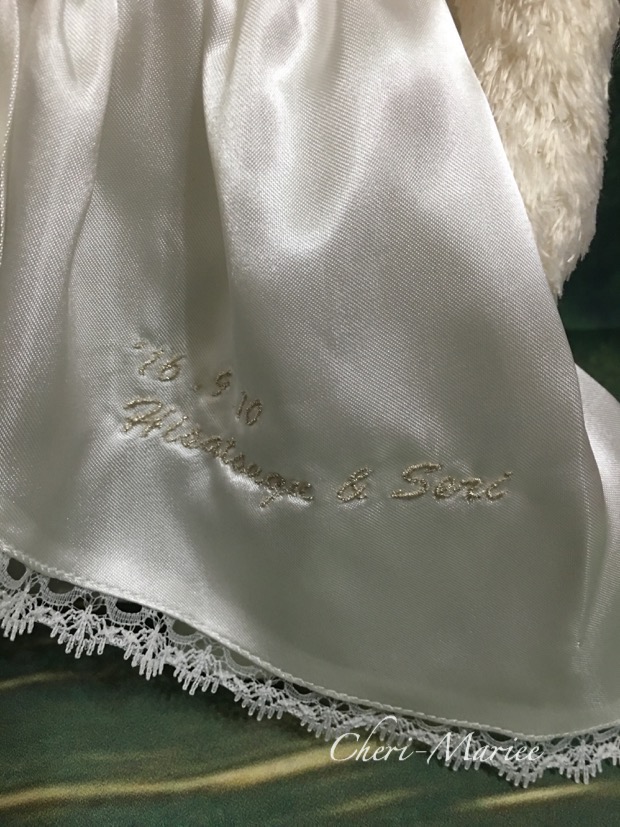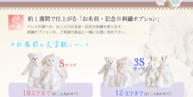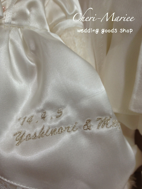 各ウエディングベアのドレス左裾にお名前と記念日を刺繍致します。