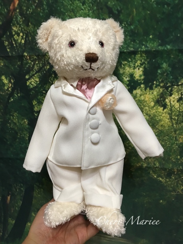 オフホワイトの衣裳に身を包んだ、上品なウェルカムベアです。