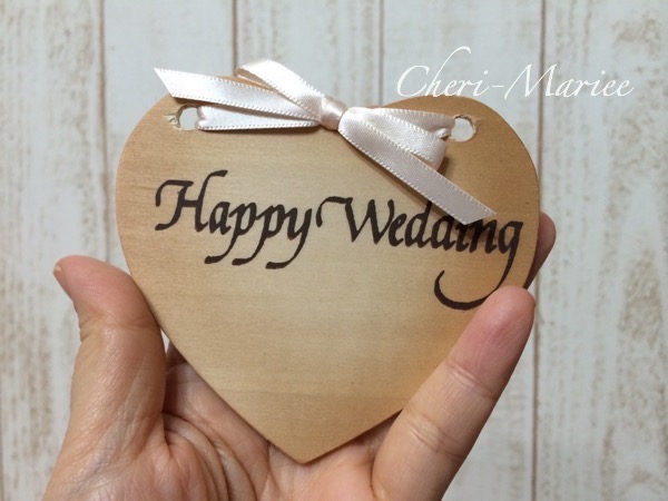 木製プレートには、このように「Happy Wedding」の文字だけがあらかじめ印字されていますので、お名前と日付を代筆させていただきます。 大文字と小文字も自由ですので、表記したい文字をお知らせください。(アルファベットのみとなります) |