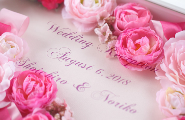 新郎様、新婦様のお名前をローマ字で、備考欄に 入力してください。 また、記念日(挙式日など)を西暦でお知らせください。 記入例)Nobuhisa & Yumiko 2014.12.24 |