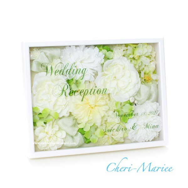 アートフラワーをふんだんにあしらった、フラワーアレンジつきウェルカムボードなら シェリーマリエにおまかせください。人気の立体タイプウェルカムボードです。 |