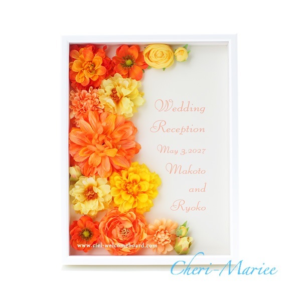 アートフラワーをふんだんにあしらった、フラワーアレンジつきウェルカムボードなら シェリーマリエにおまかせください。人気の立体タイプウェルカムボードです。 |