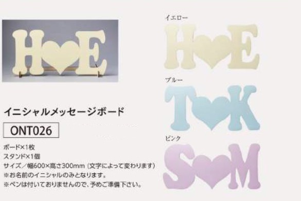 商品番号:LP-ONT026 商品名:イニシャルメッセージボード(イエロー・ブルー・ピンクの3色から選べます) 本体価格18000円(消費税・送料別) 〜下記の方法でご注文いただけます。〜 (簡単ご注文フォームはこちらから) ↑PDFファイルが開きますので、ご自宅のプリンターで印字してご利用ください。 |