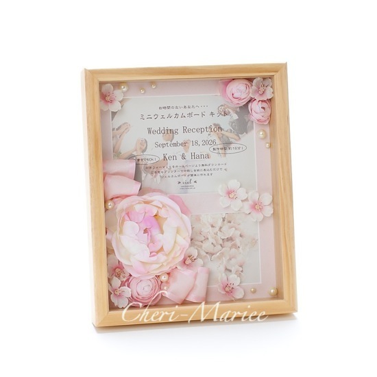 額:約22×27×4.5cm お裁縫が苦手・・時間がない!そんな方にお勧め簡単キット。手作り初心者の方でもとっても作りやすいウェルカムボードキットです。額から台紙を外し印刷、または手書きで記入した紙を裏面から固定。テープ等でしっかり固定した台紙を額に戻すのみの簡単キットです。台紙には既にお花付きです。 キット内容●額・・太子サイズ 用意するもの両面テープ |