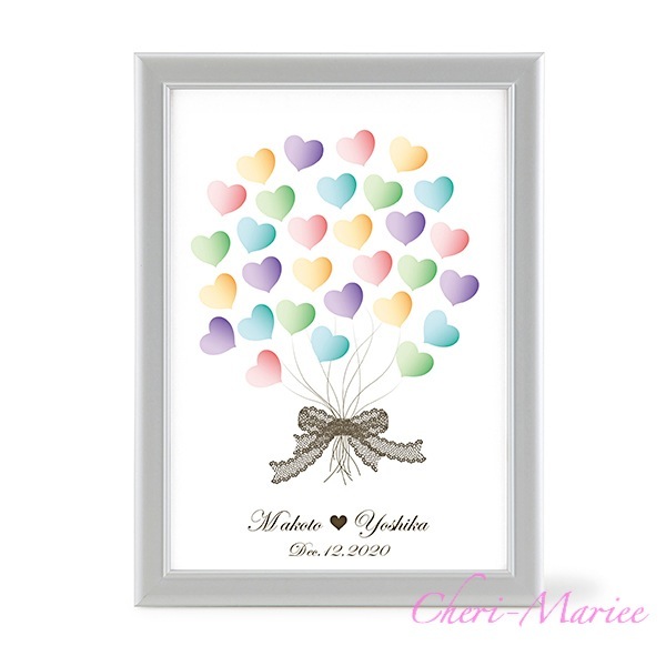 商品番号:ENW-016 商品名:シェリールメモリーボード「ハートバルーン」 (ホワイトの額縁つき、お二人のお名前&記念日プリント込み価格)