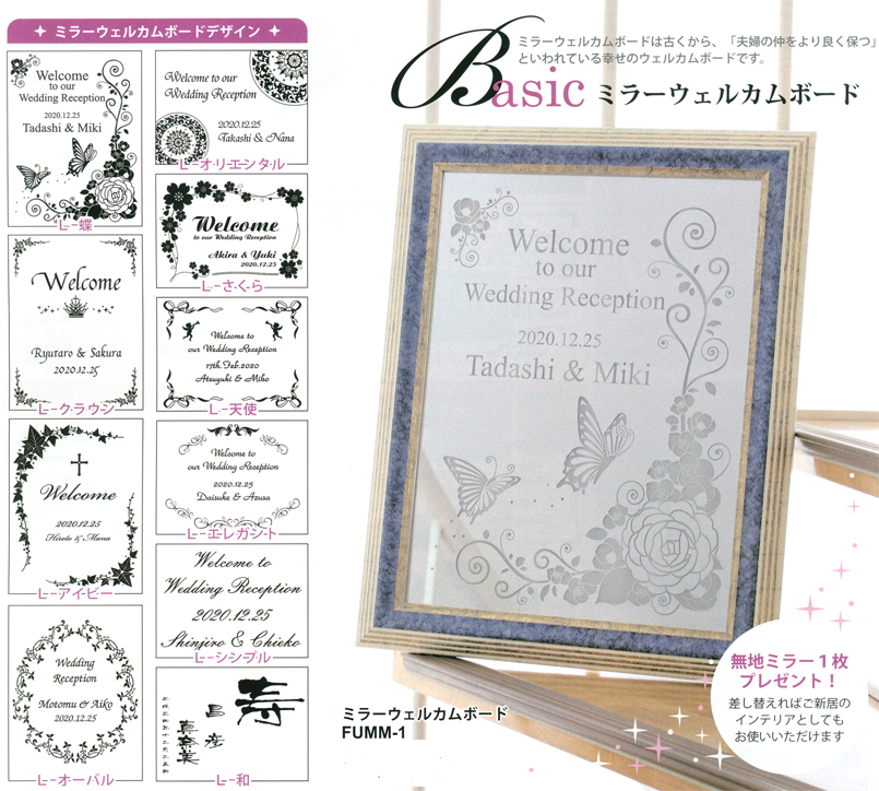 | 商品名 | FS-FUMM-1:無地ミラー1枚おまけつき、ミラーウェルカムボード 本体価格14800円(消費税・送料別) ※無地ミラー1枚も価格に含まれます。 |