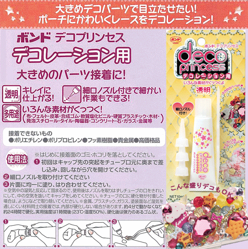 | 内容 | サイズ(約):9.5cm いろんな素材がくっつくから、盛りデコやスイーツデコに最適!無色透明で、嫌なにおいもしません。細口ノズルに付け替えれば、細かな作業もできます! ※接着できないもの…ポリエチレン、ポリプロピレン、フッ素樹脂、貴金属、高価格品 |
