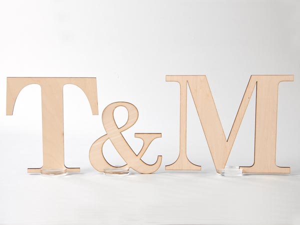 天然木素材の、シンプルなイニシャルオブジェです。透明のスタンドに立てて飾れます。