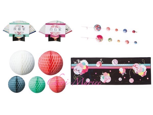受付を和モダンな雰囲気で、色とりどりに華やかに飾るお得なセット。和婚の方へオススメしたい、今流行のスタイルです◎ てまりオーナメント(2個セット)・扇子ネームスタンド(2個セット) プレート2枚・ペーパーボールオーナメント(5個1セット)・テーブルライナー1枚