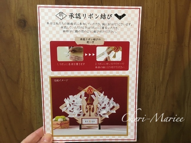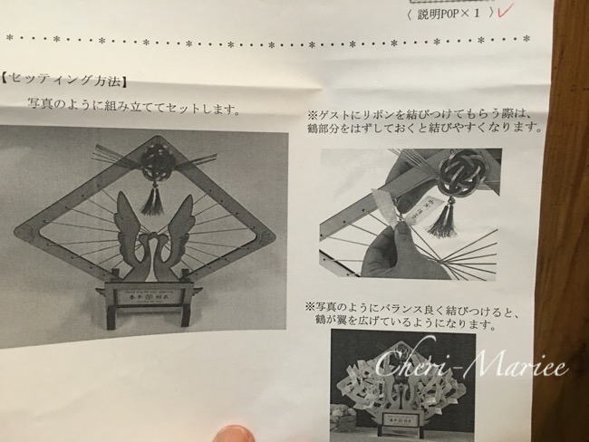 ゲストの方に、お名前やメッセージを書いていただき、鶴モチーフの本体にくくりつければ、
