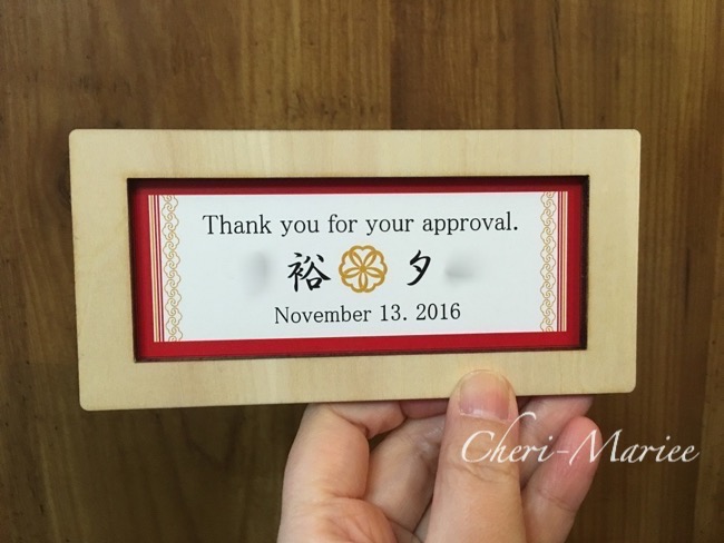 お二人のお名前と、記念日の印字が入ったプレートがついています。