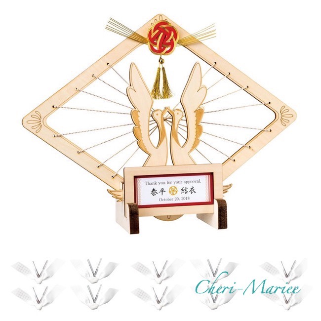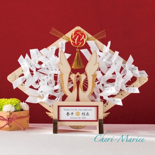 承認の証のリボンが未来へ羽ばたく鶴の羽根になる。二羽の縁起の良い鶴が、羽を広げておふたりの門出を祝福。ゲストからサインしてもらった承認が増えるたび、羽ばたきが増していきます。◎セットアップ:W40×D10×H29.5cm リボン30個 木製結び台1個 鶴飾り1個 脚2個 水引飾りネームプレート ※説明ポップ付(P53参照) ※ネームプレートには、おふたりのお名前と挙式日をお入れしますので、ご使用日の3週間前までにご注文ください。 ※天然木を使用しているため、色等変わる場合がありますので、ご了承ください。 ※リボンは、予告なく変更になる場合があります。 ※表紙におふたりのお名前と挙式日をお入れしますので、納品日の3週間前までにご注文ください。 |