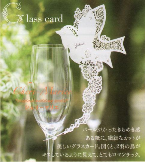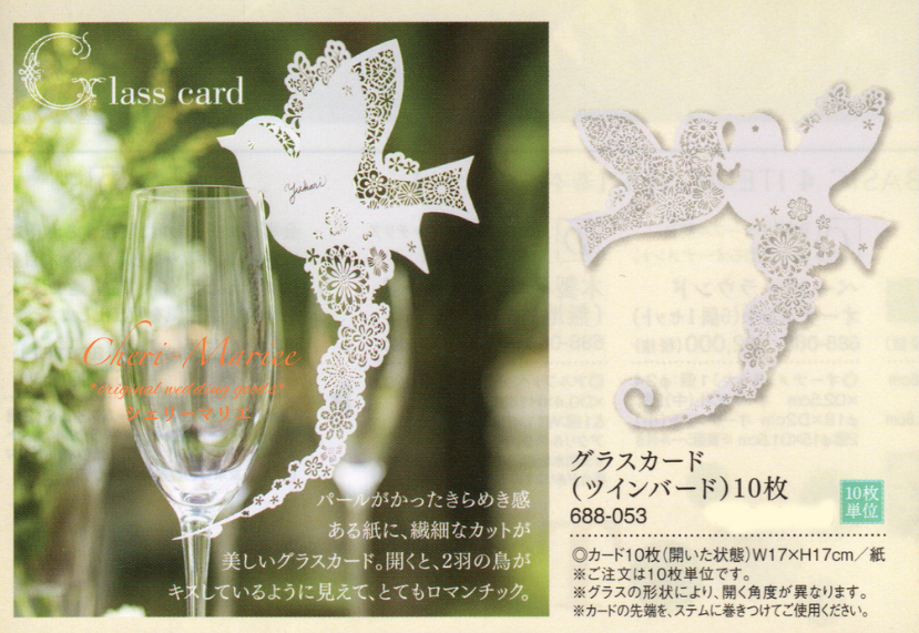 | 商品名 | 品番:688053 席札としても使えます!鳥の形をしたグラスカード10枚セット 本体価格3000円+税 〜下記の方法でご注文いただけます〜 (簡単ご注文フォームはこちらから) ↑PDFファイルが開きますので、ご自宅のプリンターで ↑ご都合のよい時間帯に、こちらからお電話いたします。 ↑お急ぎの方は、お気軽に納期目安をご相談ください。 |