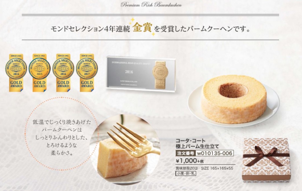 | 商品内容 | 品番:w010135 本体価格 1000円(消費税・送料別) (簡単ご注文フォームはこちらから) ↑PDFファイルが開きますので、ご自宅のプリンターで印字してご利用ください。 モンドセレクション4年連続金賞。とろけるような柔らかさで、引き菓子に人気。 独自の製法でバームクーヘンを一層しっとりとした食感に焼き上げました。甘さ控えめの軽やかな味わいです。素材の味を生かした極上の卵味。バームクーヘンのなめらかな口溶けをぜひ一度ご賞味下さい。