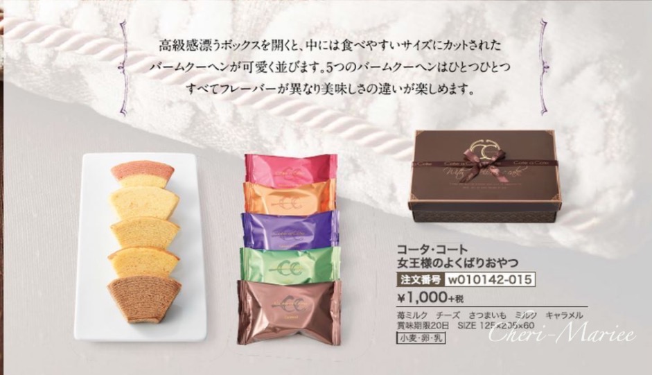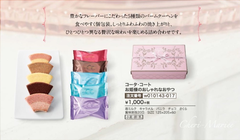 | 商品内容 | 品番:w010142 本体価格1000円(消費税・送料別) (簡単ご注文フォームはこちらから) ↑PDFファイルが開きますので、ご自宅のプリンターで印字してご利用ください。 引き菓子にぴったりの食べやすい個包装タイプのバウムクーヘンセット。 高級感漂うボックスを開くと、中には食べやすいサイズにカットされたバームクーヘンが可愛く並びます。5つのバームクーヘンはひとつひとつ違ったフレーバーをお楽しみいただけます。