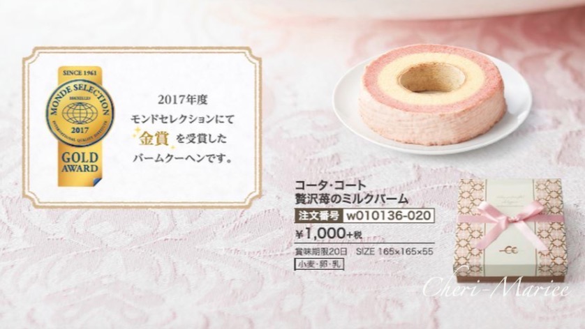 | 商品内容 | 品番:w010153 本体価格1200円(消費税・送料別) (簡単ご注文フォームはこちらから) ↑PDFファイルが開きますので、ご自宅のプリンターで印字してご利用ください。 テレビでも話題。とちおとめ(苺)とヴァローナチョコを贅沢に使った引き菓子にぴったりのバウムクーヘン。 とちおとめ苺のフレッシュな甘酸っぱさと、コク豊かな最高級チョコレート「ヴァローナ」のゴールデンバランス。まさにラグジュアリーなひとときを演出してくれるスイーツです。