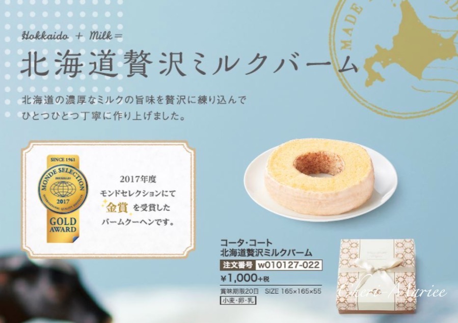 | 商品内容 | 品番:w010127 本体価格1000円(消費税・送料別) (簡単ご注文フォームはこちらから) ↑PDFファイルが開きますので、ご自宅のプリンターで印字してご利用ください。 北海道の濃厚なミルクを贅沢に練りこんだバウムクーヘンは引き菓子におすすめ。 2017年モンドセレクションにて金賞受賞。北海道の濃厚なミルクの旨味を贅沢に練りこんでひとつひとつ丁寧に作り上げました。