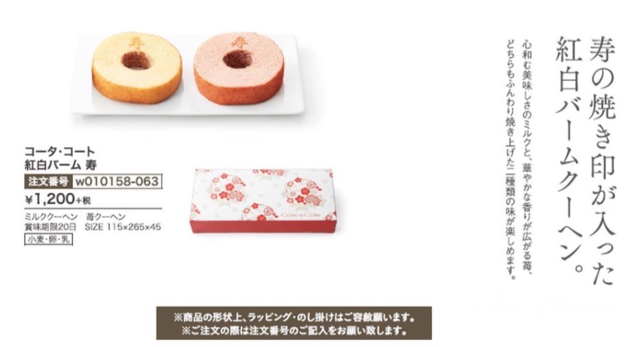 | 商品内容 | 品番:w010158 商品名:コータ・コート 紅白バーム 寿 本体価格1200円(消費税・送料別) (簡単ご注文フォームはこちらから) ↑PDFファイルが開きますので、ご自宅のプリンターで印字してご利用ください。 寿の焼印が入った紅白のおめでたいバウムクーヘンセットは引き菓子におすすめ。 寿の焼き印も目を引くバームクーヘンは華やかな香りが広がる苺と心和む美味しさのミルク、ふんわり焼き上げた2種類の味が楽しめます。ミニサイズのバームも紅白に可愛く並ぶおめでたいギフトです。