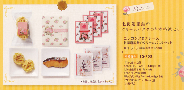 | 商品名 | エレガンス&グレース 本体価格:1000円(消費税別) ※ご希望の数量を四角の中に入力してから「カートに入れる」のボタンを押してください。 ※大変恐れ入りますが、10個以上1個単位にてご注文ください。(同じ「エレガンス&グレース」シリーズの中でしたら組み合わせ自由です) |