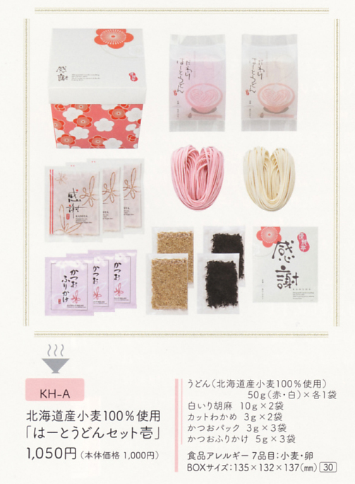| 内容 | うどん(北海道産小麦100%使用)50g(赤・白)×各1袋 白いり胡麻10g×2袋 カットわかめ3g×2袋 かつおパック3g×3袋 かつおふりかけ5g×3袋 ※ボックスイメージ |