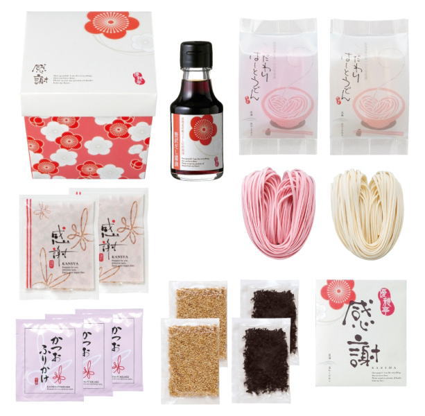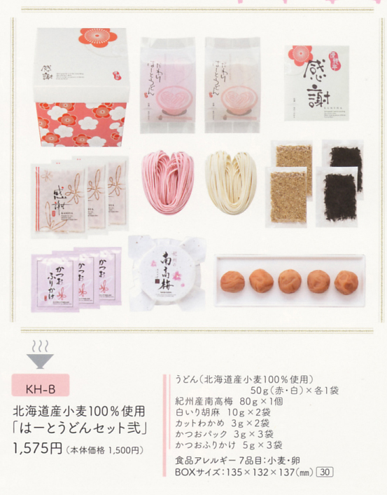 | 内容 | うどん(北海道産小麦100%使用)50g(赤・白)×各1袋 紀州南高梅80g×1個 白いり胡麻10g×2袋 カットわかめ3g×2袋 かつおパック3g×3袋 かつおふりかけ5g×3袋 ※ボックスイメージ |