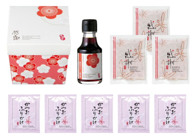 | 内容 | 北海道産干し貝柱使用だし醤油100ml×1本 かつおパック3g×3袋 かつおふりかけ5g×5袋 ※ボックスイメージ |