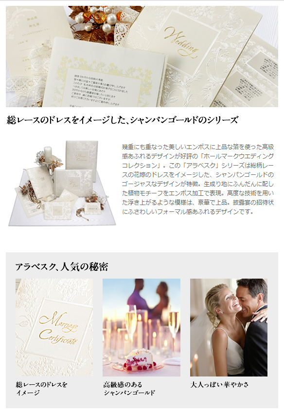 幾重にも重なった美しいエンボスに上品なパール箔を使った高級感あふれるデザインが好評の「ホールマーク ウエディングコレクション」。 この「アラベスク」シリーズは総柄レースの花嫁のドレスをイメージした、シャンパンゴールドのゴージャスなデザインが特徴。 生成り地にふんだんに配した植物モチーフをエンボス加工で表現。高度な技術を用いた浮き上がるような模様は、豪華で上品。 |