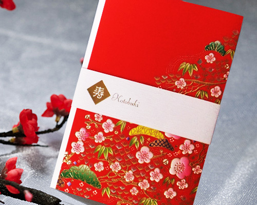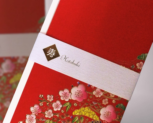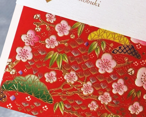 何度も色を直した紅色やエンボスの質感が贅沢なカードです。