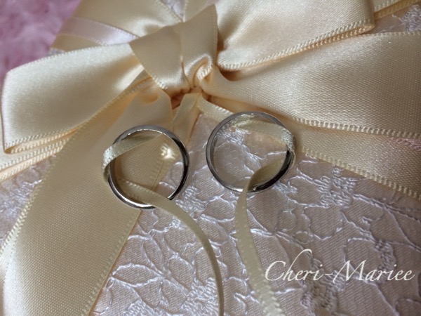 ドラマティックリボン・シャンパンリングピローは、細いサテンリボンにリングをからめて使います。