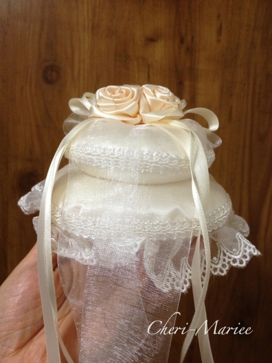 とても立体的なリングピローです。まるでウェディングケーキみたい!