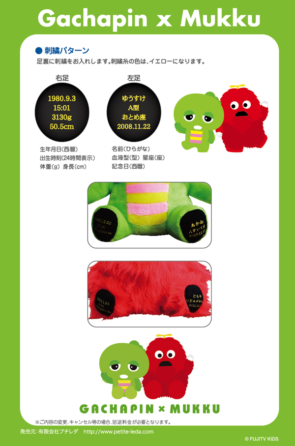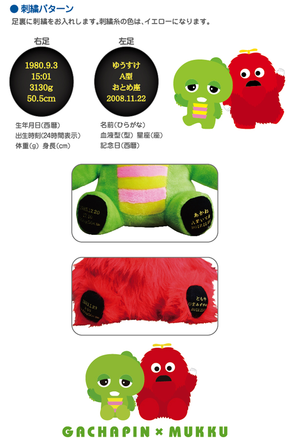 | 内容 | 活躍の場を広げる我らがガチャピンとムックが、披露宴の感動をより一層盛り上げる演出アイテムとして登場です。あなたが生まれた時の体重で作る可愛いウェイトドールです。みどりのぬいぐるみの「ガチャピン」の方を製作いたします。