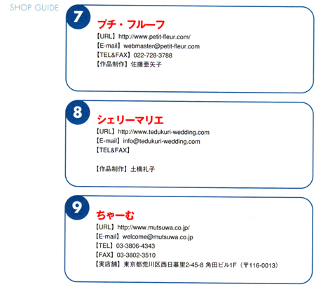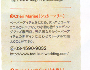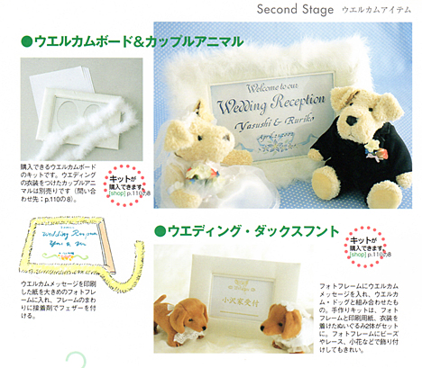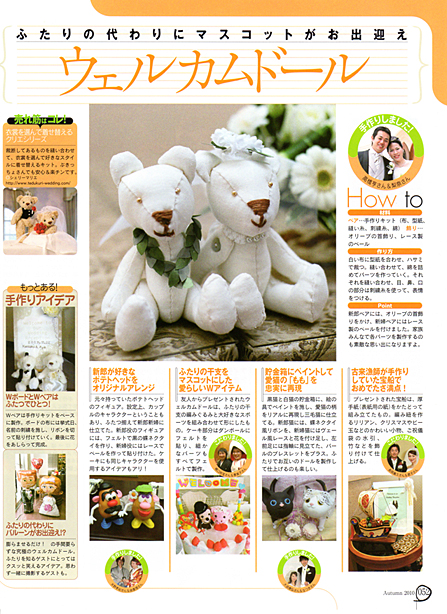 ウェディングアイテムの手作りアイデア満載。商品も充実していて、リングピローやマリエグッズなどは、完成品のほかに手作りキットもリーズナブルになっている。 夜間や急ぎの配達にも対応してもらえるので、働いている人でも安心。 (けっこんぴあ紙面より抜粋) ←雑誌に載せていただけるとのことで、ウェルカムベアたちを撮影して編集者の方にお送りしたところ、左のように掲載していただきました。素敵なコメントまでいただき、ありがとうございます。 |
