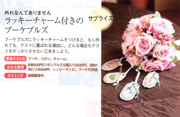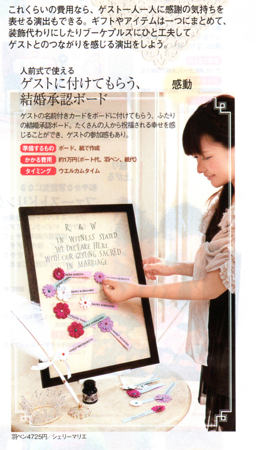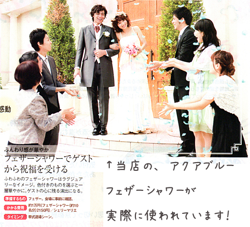 「10000円以下でできる演出」に当店の羽ペン、フェザーシャワー、リボンプルズチャームを写真入りでご紹介いただきました。