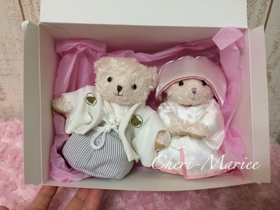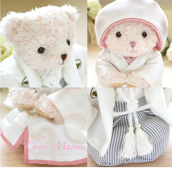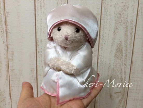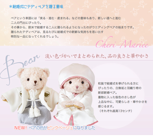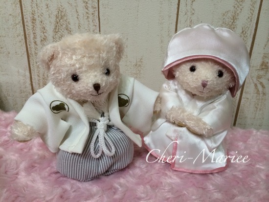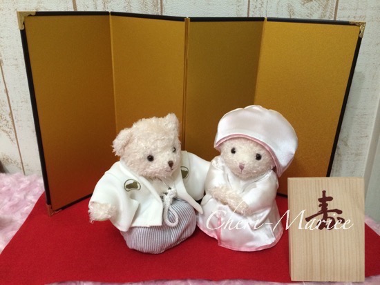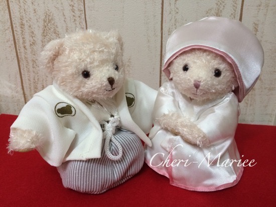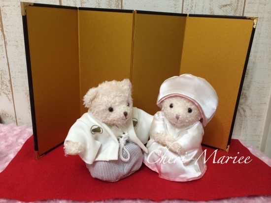 新婦ベアは、清楚な白無垢姿。ピンクのふちどりがキュートです。