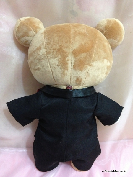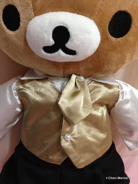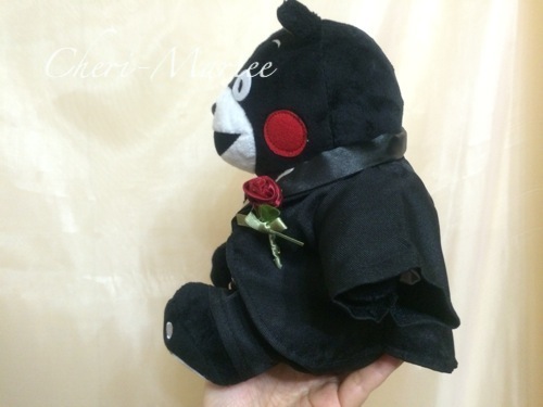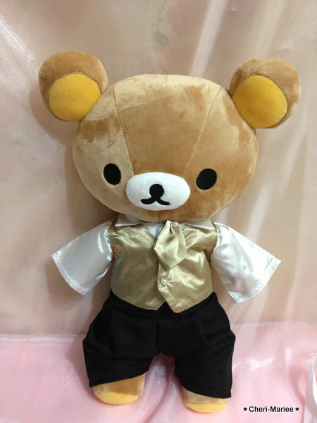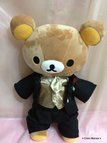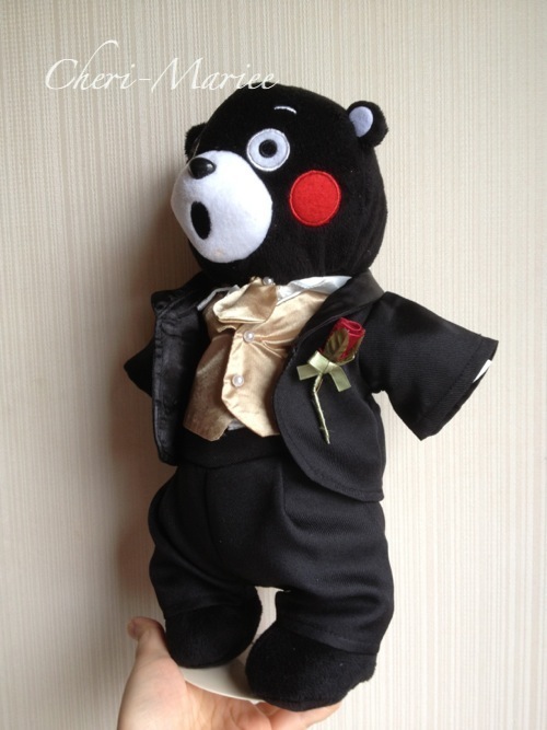 立ち姿のくまもんにLサイズのタキシードを着せた例です。ぴったりですね!