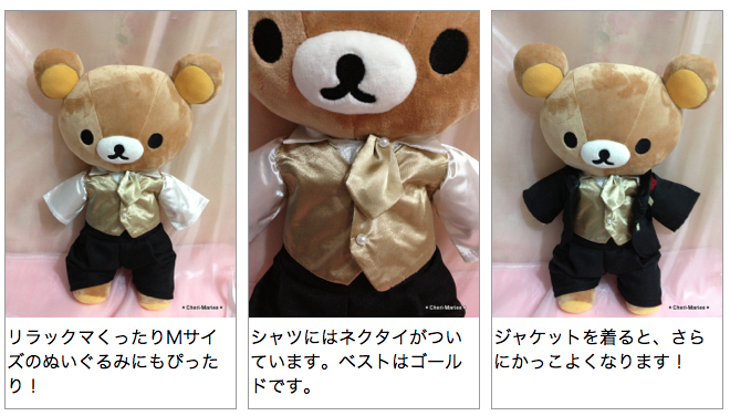 (メールはinfo@tedukuri-wedding.comにお送りください) 基本的にはウェルカムベア用の衣装ですので、キャラクターものなど、 胴回りが違うぬいぐるみの場合はうまく着せられない場合もあります。 ご心配な方はまずはご相談ください。 今までに着せてみた経験などからお答えいたします) |