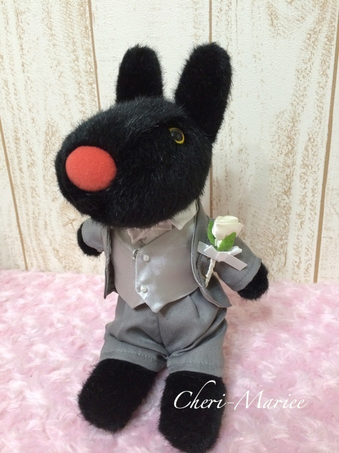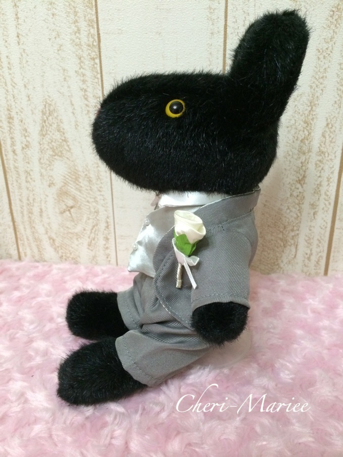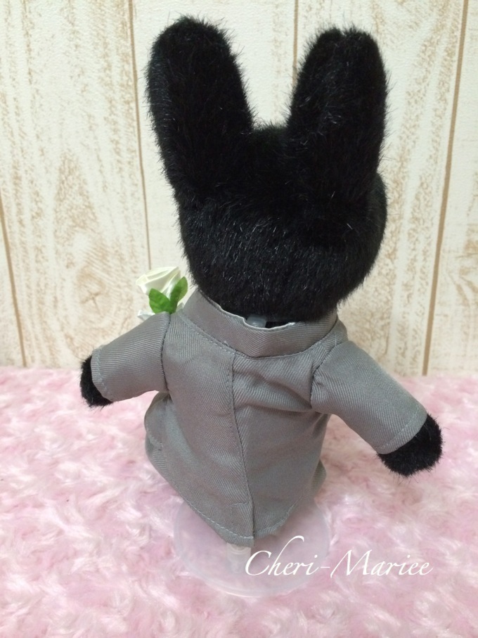 タキシードSサイズを着せて、この半透明ドールスタンドをつけた様子です。