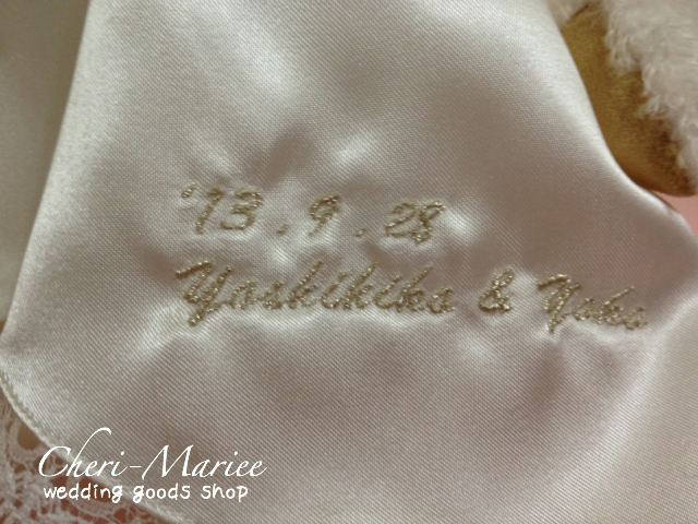 記念日とお二人のお名前刺繍がドレスの裾に入ります。