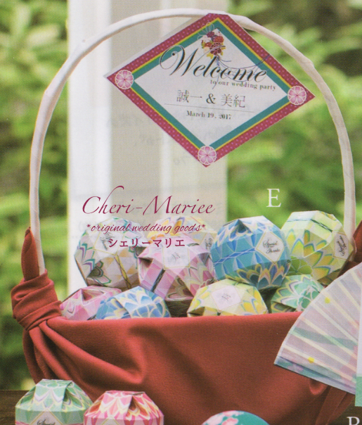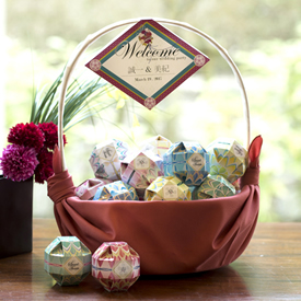 可愛らしいてまり型のプチギフトをカゴに盛った、和テイストのウェルカム。