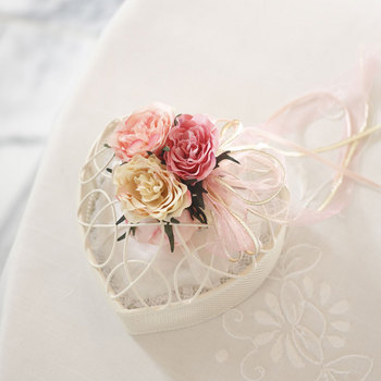 | ■サイズ 約12cm×約12cm ■使用部材 ハート型カゴ、リボン、オーガンジーリボン、サテンクッション、パールビーズ、お花 |
