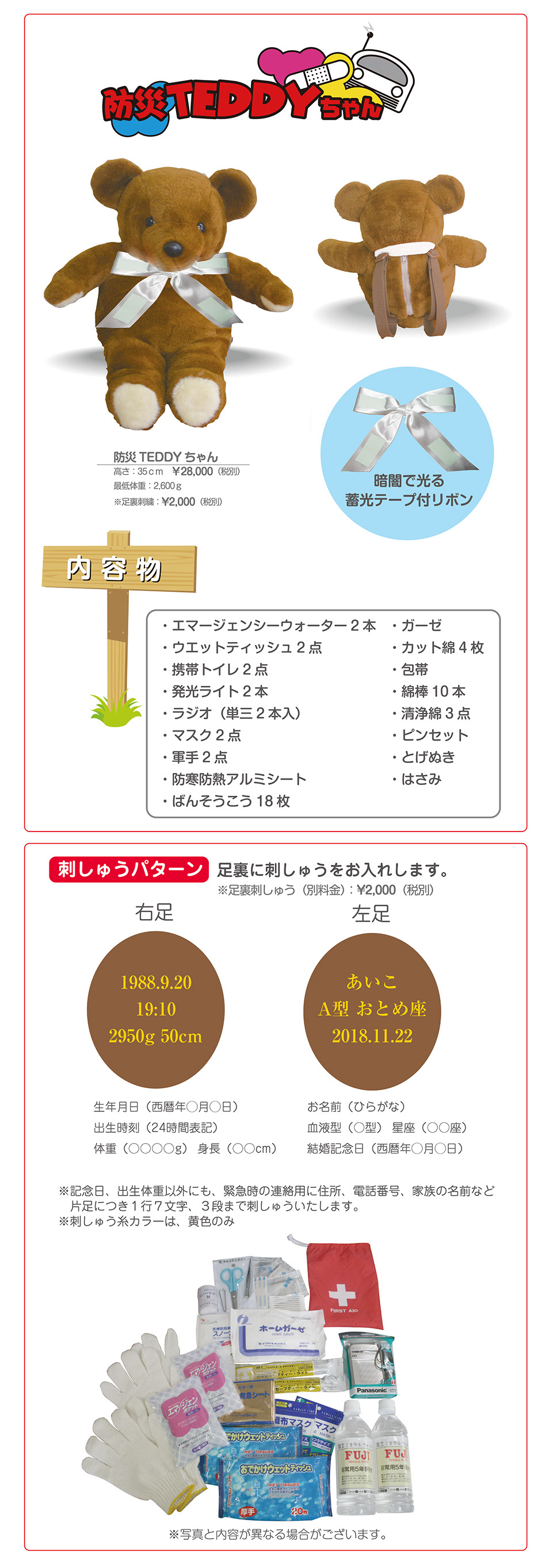 | 商品名 | 商品番号:bousai-teddy 商品名:防災テディーちゃん(足裏刺繍入り体重ベア) ※生れたときの重さに1g単位で再現するぬいぐるみです。足裏刺繍込みの金額です。 本体価格・1体30000円+税 〜下記の方法でご注文いただけます。〜 (簡単ご注文フォームはこちらから) ↑PDFファイルが開きますので、ご自宅のプリンターで