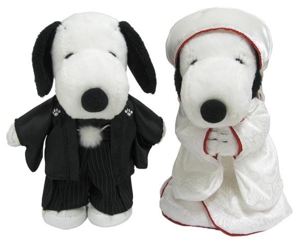 スヌーピーとベルのウエディングドールです。二人とも花婿と花嫁の衣装を身に着け、ご結婚される人たちを祝福しています。