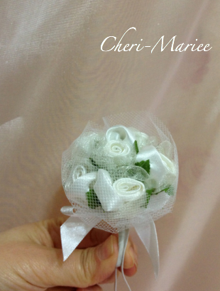 パールネックレス、ブーケ、ドレスがセットです。ブーケは白いサテンローズ。