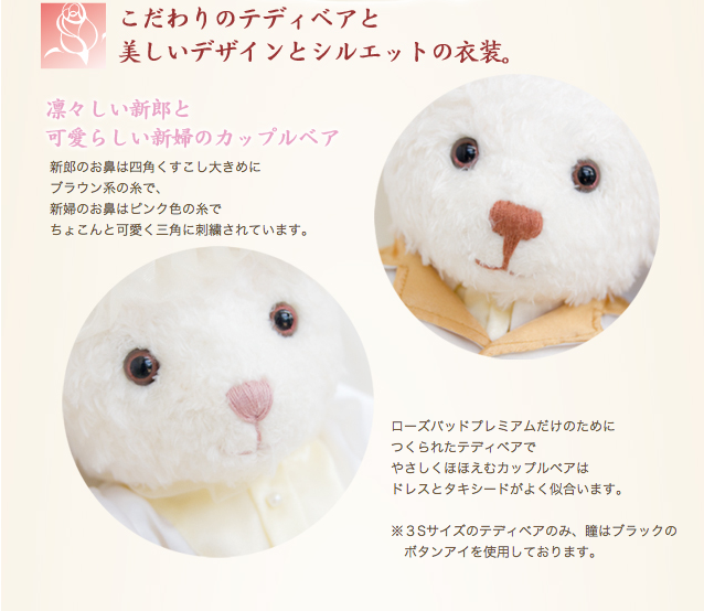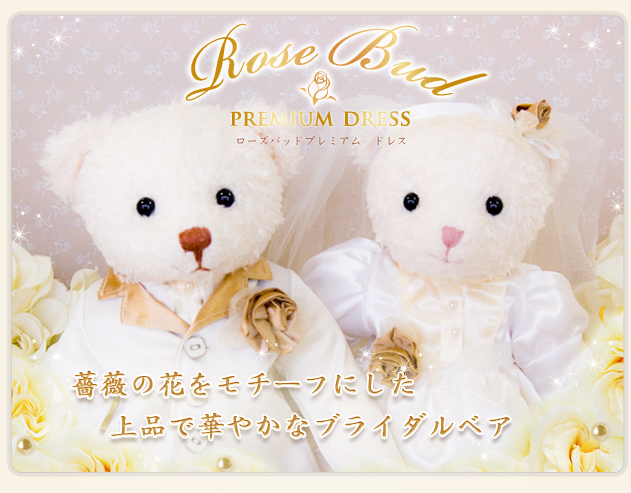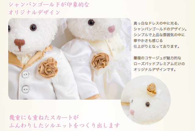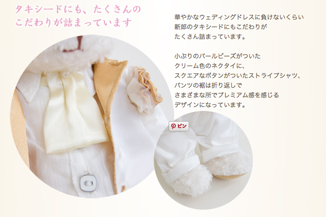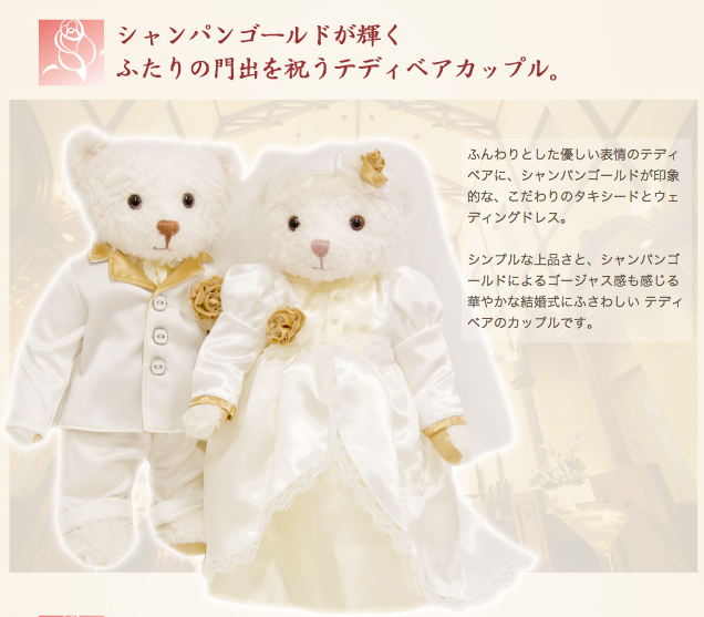 | 内容 | 純白の世界にシャンパンゴールドの輝きが美しい、上品でゴージャスな洋装のペア。ドレスへ刺繍が入ります。 (足裏には入りません) 新郎:身長35p、新婦:身長33p ※書体はアルファベット(頭大文字+小文字)のみとなります。 特別な日の想い出のブライダルベア、お名前や記念日が入ればもっと特別感あふれるテディベアに出来上がります。ご注文から約1週間でお届けします。 |