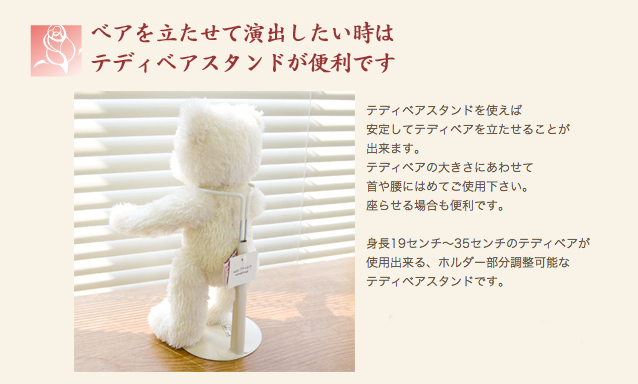| コメント | ネックホルダーの部分は長さ調節ができます。 テディべア用のドールスタンド。土台はベージュがかったお色になっています。 新郎と新婦でお使いになる場合は、2本お求めください。 |