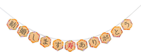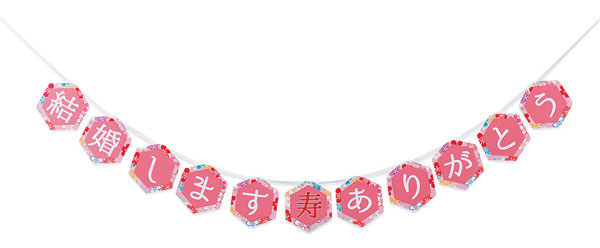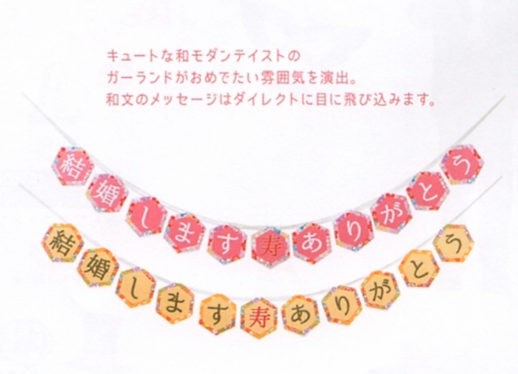 キュートな和モダンテイストのガーランドが、おめでたい雰囲気を演出。和文のメッセージはダイレクトに目に飛び込みます。