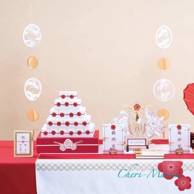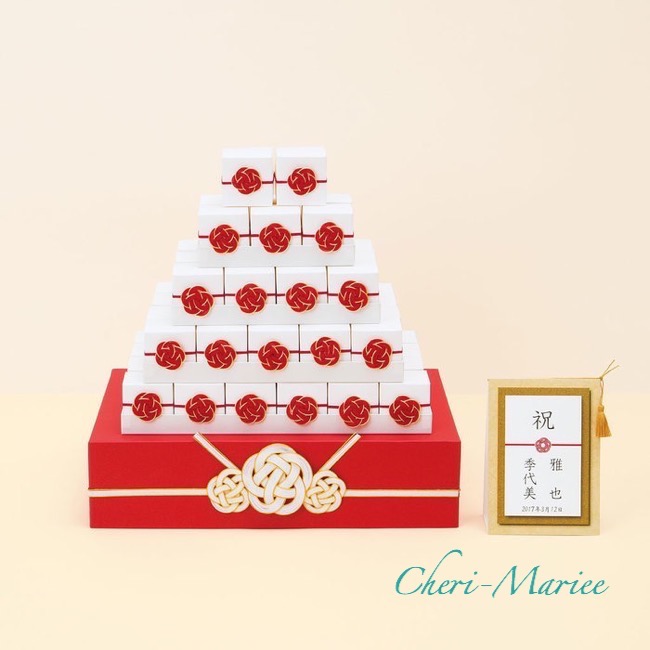 「末永いお付き合い」を願う水引で、感謝に満ちた贈り物。紅白金を使った、すっきりとした印象の正統派ウェルカムセット。立体感のある水引をふんだんに使い、おめでたさを醸し出します。◎金箔こんぺいとう10g×64個 セットアップ:W37×D28×H36cm 水引飾り ネームプレート 水引は、予告なく変更になる場合がありますのでご了承ください。 ※ネームプレートにはおふたりのお名前と挙式日をお入れしますので、ご使用日の3週間前までにご注文ください。 |