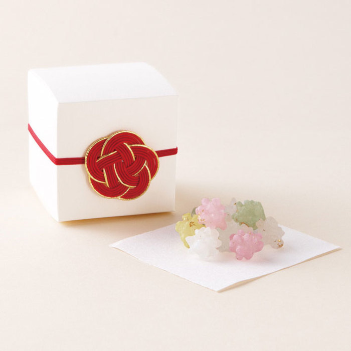 紅白のパッケージがお目出度いプチギフトです。中には金平糖が入っています。